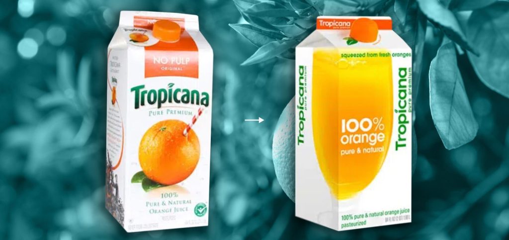 È quello che è successo a Tropicana nel 2009. L’azienda ha ridisegnato il packaging eliminando tutti gli elementi distintivi che i consumatori identificavano a colpo d’occhio: l’arancia con la cannuccia e il prominente logo orizzontale. Al loro posto, un design minimalista.