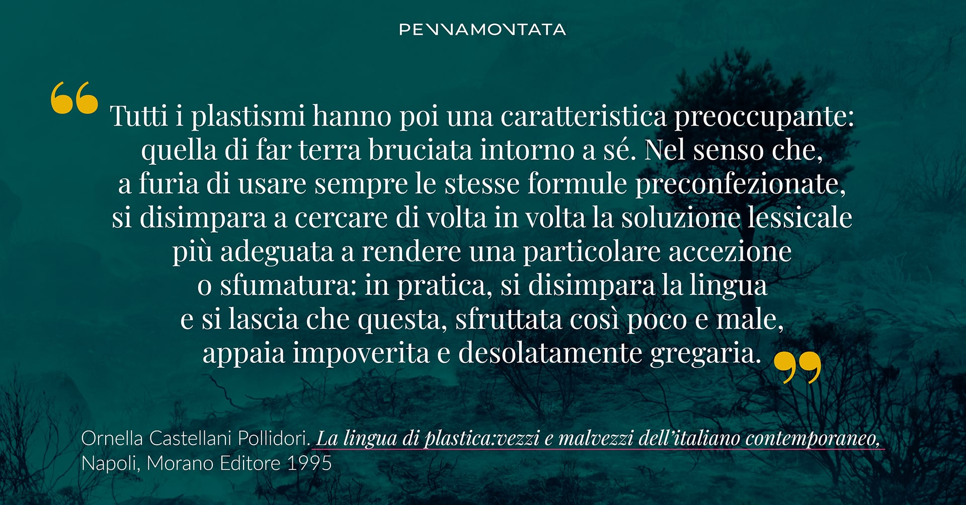 Ho deciso di scrivere un articolo sulle espressioni da usare il meno possibile quando si scrive o si parla: aggettivi inflazionati, formule astratte, tormentoni, strafalcioni. Insomma: plastismi della lingua. Questo articolo è iniziato con una lista, da cui è scaturita, a cornice, una piccola riflessione. Una riflessione che – ci tengo a precisarlo – non è di una linguista, ma di un’umile copywriter che ogni giorno si arrabatta con la lingua italiana, cercando di non farle troppi sgarbi.